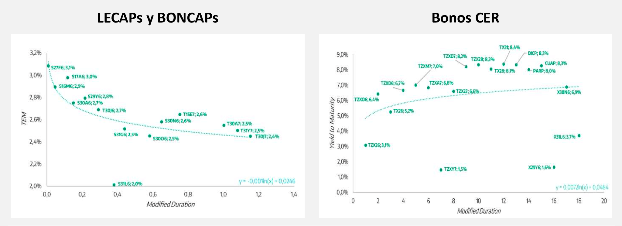 En términos de breakeven entre la curva CER y la tasa fija, las expectativas implícitas se desplazaron y se ubican en torno a 2,2% mensual hasta abr-26, 1,8% entre esa fecha y oct-26, y aproximadamente 1,4% mensual para los plazos más largos.