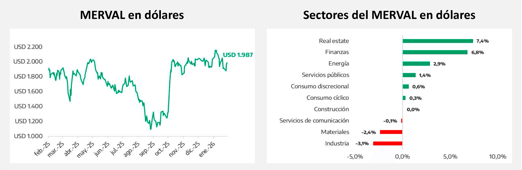 En el ámbito local, los bonos globales argentinos no lograron desacoplarse de la suba de tasas en Estados Unidos y retrocedieron en promedio 0,3%, con rendimientos que se mantienen en el rango de 7% – 9%. En contraste, la renta variable exhibió una performance moderada en moneda local, aunque se vio favorecida por la apreciación cambiaria, lo que permitió que el Merval avanzara 3,5% medido en dólares.