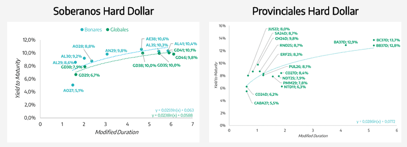 La curva mantuvo una pendiente positiva, con mejor desempeño relativo en el tramo largo (GD46 +2,2%; GD41 +1,9%) y movimientos algo más acotados en bonos cortos (GD29 +1,5%; GD30 +1,6%). La dinámica en las durations más largas sugiere una recomposición táctica, en un contexto donde la curva continúa operando en niveles de rendimiento elevados.