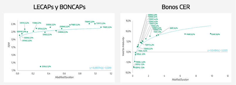 El tramo CER mostró subas generalizadas (+3,2% en promedio), con un mejor desempeño relativo en la parte larga de la curva (CUAP +4,8% y TX31 +4,0%). En el resto de los tramos, las variaciones fueron de similar magnitud, reflejando una dinámica relativamente pareja a lo largo de la curva, aunque con sesgo positivo en las durations más elevadas.