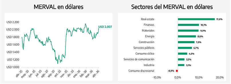 A nivel sectorial en moneda dura, el liderazgo se concentró en real estate y energía (+17,6% y +10,1%), seguidos por materiales (+9,9%), mientras que los sectores más vinculados a la economía real mostraron caídas (consumo discrecional -0,9%). La dispersión refleja un posicionamiento selectivo, con preferencia por ingresos dolarizados y drivers regulatorios.