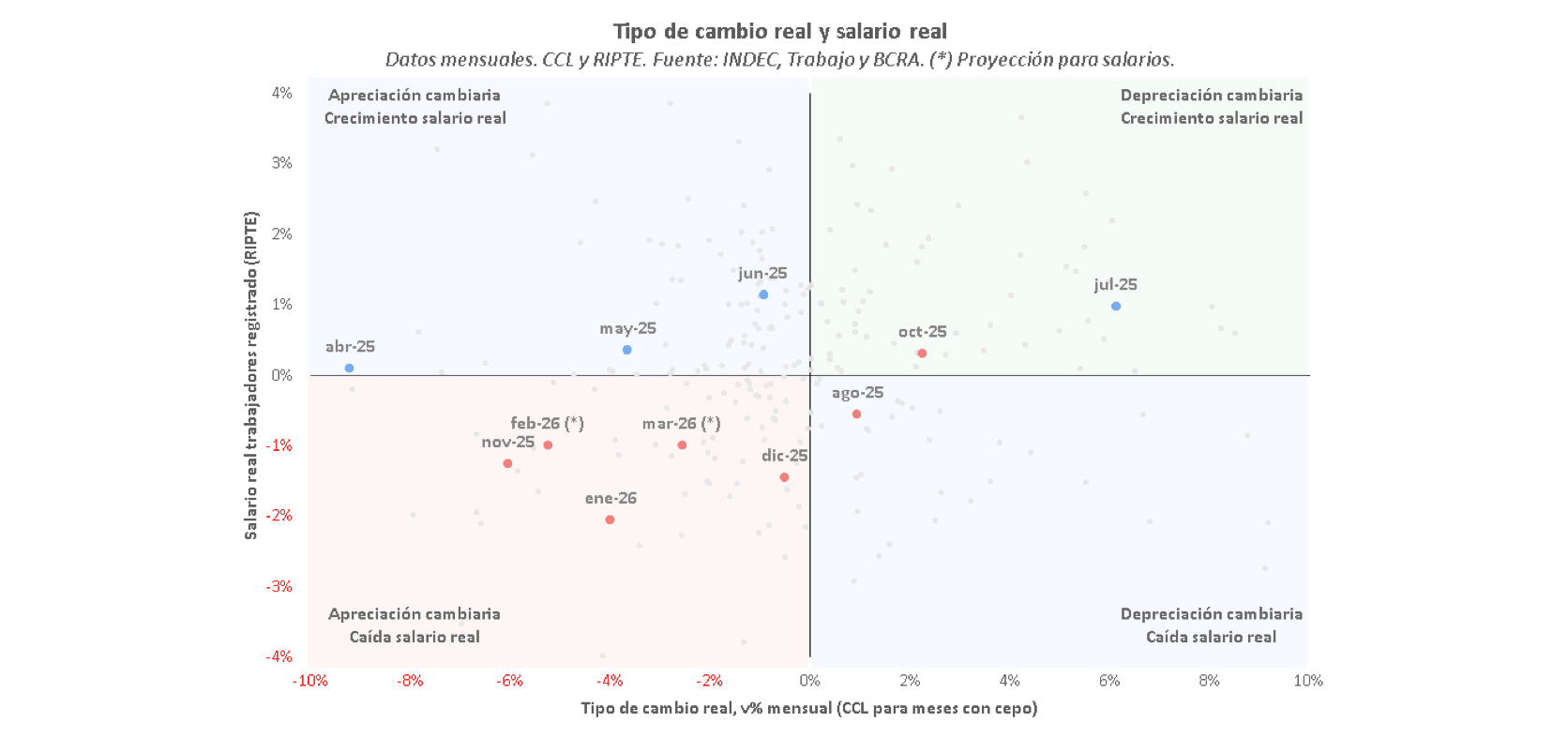 ✓ Entre noviembre de 2025 y enero de 2026, datos oficiales del Banco Central y la Secretaría de Trabajo, el tipo de cambio real se apreció 8% y los salarios formales cayeron 4,5%. En febrero y marzo, el tipo de cambio real se apreció otro 7,5%, en tanto que el poder adquisitivo de los trabajadores registrados habría caído un 2% adicional. De esta manera, podemos afirmar que estamos frente a un proceso de apreciación cambiaria con caída del salario real (-17% y -6%, respectivamente), una anomalía para la economía argentina.