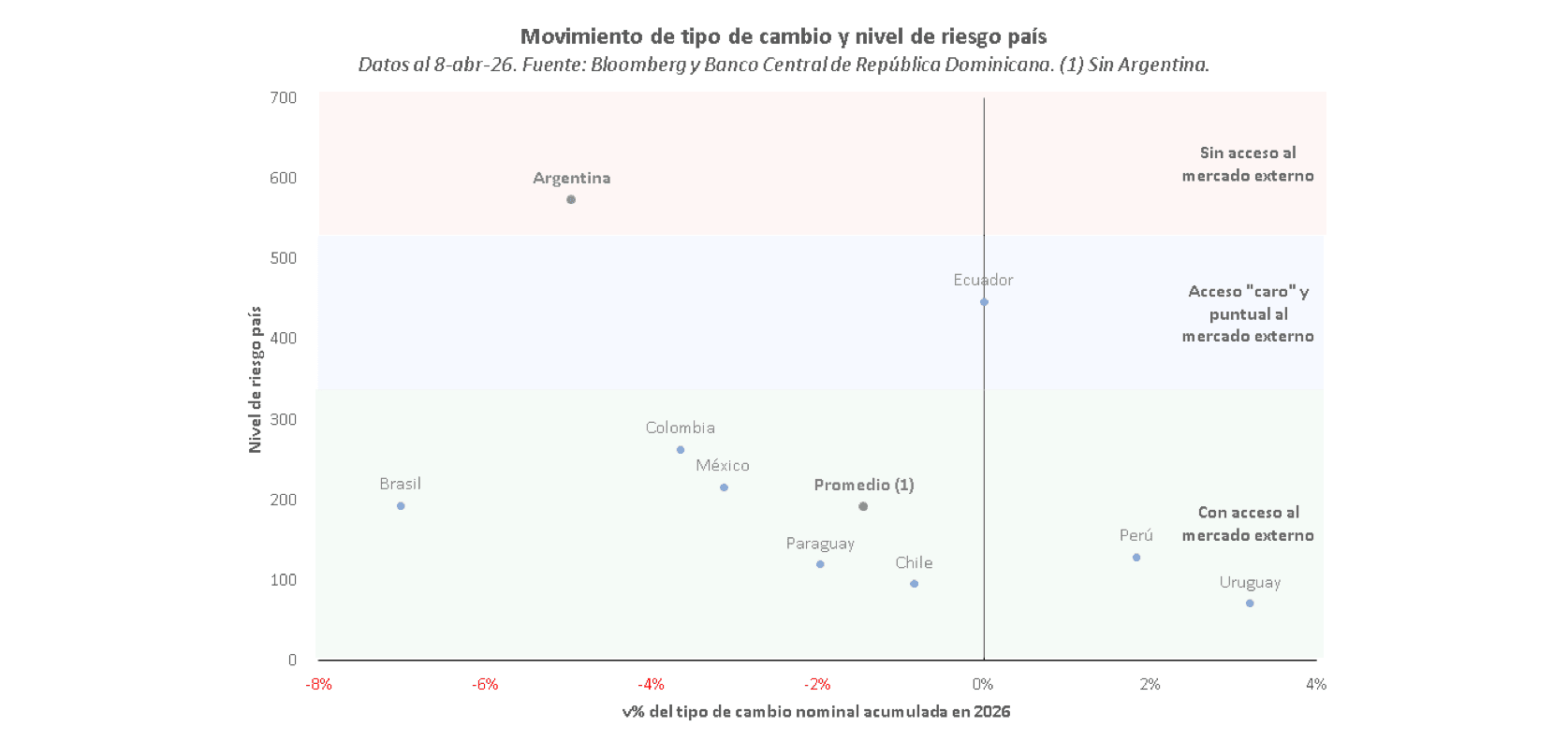 contraste, la media regional fue una caída de 10 p.b. Vale destacar que esta relajación estuvo liderada por Ecuador, el país más “riesgoso” de la región, donde el índice se contrajo 54 p.b. en el primer trimestre largo de 2026.