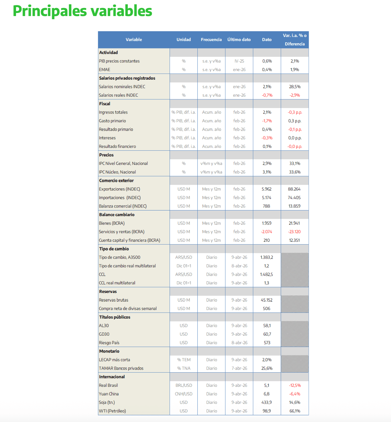 En síntesis, desde el cierre del año pasado entramos en un proceso atípico para la economía argentina, donde conviven simultáneamente i) apreciación cambiaria, ii) aceleración inflacionaria y iii) caída del salario real. Paradójicamente, esto da cierto aire a la cuenta corriente, ya que la caída de la demanda interna reduce las necesidades de importación, contribuyendo al saldo externo. Sin embargo, considerando que en los próximos doce meses (abril 2026 a marzo 2027) vencen USD 17.500 millones de deuda en moneda extranjera, el superávit de cuenta corriente no alcanzaría para cumplir las obligaciones, y el financiamiento externo al Sector Público Nacional se vuelve determinante.