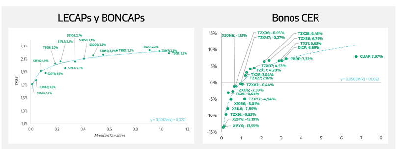 El segmento CER lideró el desempeño (+1,3% promedio), con mejor performance en la parte larga (PARP+2,9%; TZXM9 +2,7%; TX31 +1,7%). La preferencia por duration se mantuvo visible, con el tramo largo (+2,2%) por encima del medio (+1,1%) y corto (+1,1%).