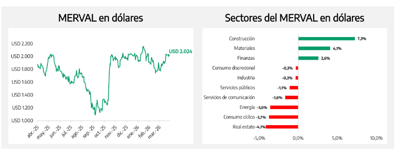 A nivel sectorial en dólares, se observaron subas en construcción (+7,3%), materiales (+4,1%) y finanzas (+2,6%), mientras real estate (-4,1%), consumo cíclico (-3,7%) y energía (-3,6%) corrigieron, reflejando rotación de factores dentro del índice.
