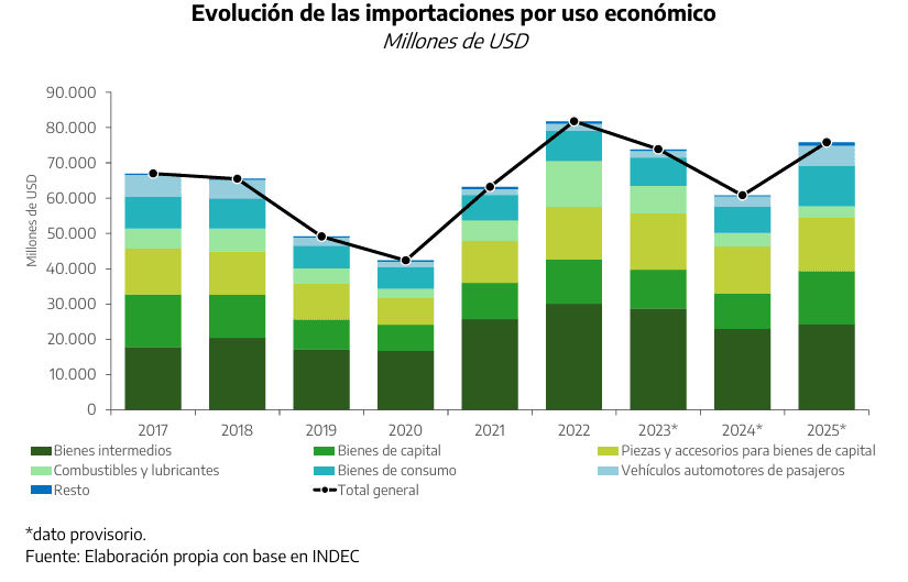 Tras años de restricciones, en el año 2024 se inició un proceso de apertura del comercio exterior a través de la eliminación gradual de mecanismos de control y racionamiento de importaciones. No obstante, es en 2025 cuando la apertura se tradujo plenamente en mayores volúmenes de compras al resto del mundo, en un contexto de crecimiento de la actividad económica. En concreto, con una economía creciendo al 4,4% en 2025, las importaciones crecieron 24,7% respecto de 2024 (alcanzaron un total de USD75.791 millones). El avance de las compras externas estuvo traccionado principalmente por la expansión en vehículos (+97,6%), bienes de consumo (+54,0%) y bienes de capital y equipo de transporte industrial (+51,3%), mientras que el uso Bienes intermedios creció de forma más acotada (+5,5%).