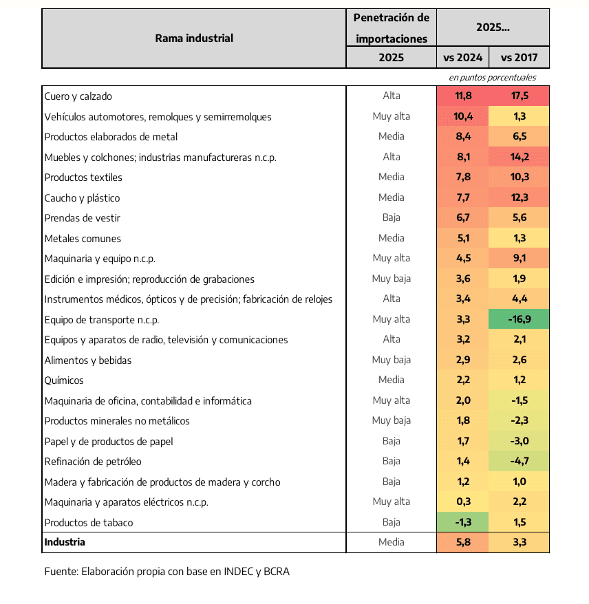 -En 2025, el indicador de penetración de importaciones muestra un fuerte incremento a nivel de agregado industrial: +5,8 p.p. vs 2024 y +3,3 p.p. vs 2017