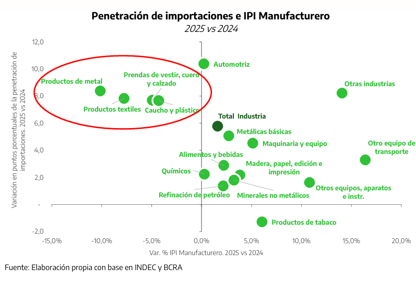 En 2025, la industria creció 1,6% comparado con 2024, según lo publicado por el INDEC en el IPI Manufacturero. Por su parte, la estimación aquí realizada para la penetración de importaciones arrojó un incremento de 5,8 p.p. entre esos mismos años, es decir casi cuatro veces más de lo que avanzó la industria. Esta reacción es esperable en un contexto de recuperación económica y demanda de tecnología reprimida.