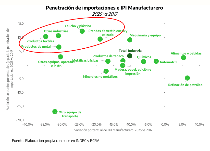 En 2025 la apertura comercial se tradujo en un fuerte aumento de las importaciones, que crecieron muy por encima de la actividad económica: +24,7% vs +4,4%. A nivel agregado, la participación de las importaciones en el mercado interno aumentó, en tanto que la industria manufacturera (sector transable) no logró expandirse al mismo ritmo y se mantiene por debajo de los niveles de producción y empleo de 2017.