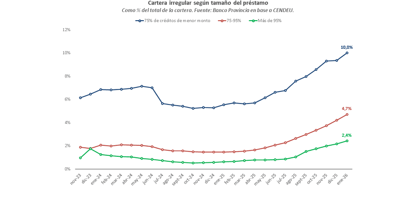 En cambio, cuando nos enfocamos en el resto del entramado productivo, el panorama se asemeja más al de los préstamos a las familias: la irregularidad de cartera llegó al 10% en el 75% de los créditos de menor monto (préstamos de hasta 45 millones de pesos). Así, la mora en el segmento de las firmas más pequeñas casi se duplicó en el último año (en enero de 2025 se ubicaba en 5,5%). Con estos números, podemos afirmar que también en el mundo empresas la irregularidad de cartera tiene un perfil regresivo: afecta más a las más chicas.