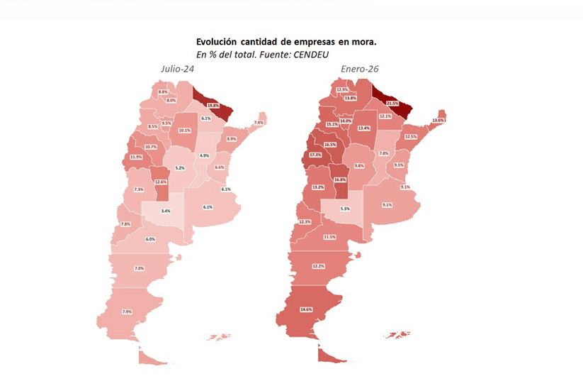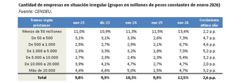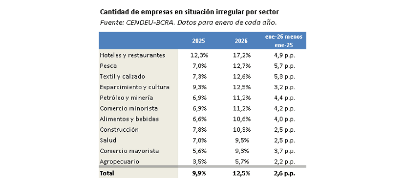 Sin embargo, al desagregar estos últimos números -con los datos de CENDEU que publica el Banco Central- el panorama es más complejo: en enero de 2026, 1 de cada 8 empresas que pidió un préstamo se encontraba en situación irregular (12,5%), marcando un avance de 2,6 p.p. respecto del arranque de 2025 (+9,9%). El año pasado, entonces, no solo creció el nivel de actividad: también lo hizo, y de manera generalizada, la irregularidad de cartera.