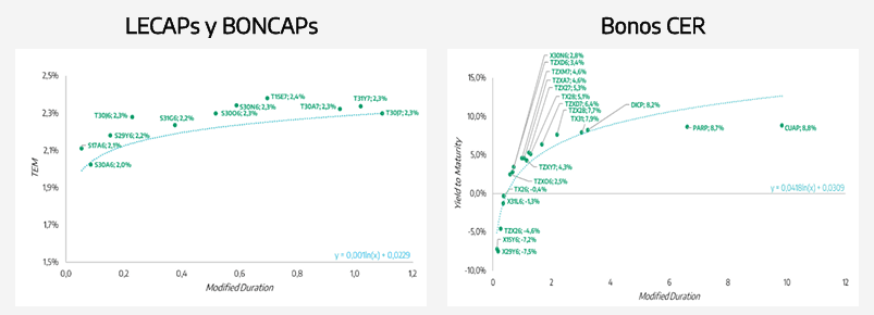 En contraste, los instrumentos duales registraron una suba moderada (+0,3% promedio), reflejando menor demanda relativa por cobertura implícita. Por su parte, la curva a tasa fija subió 1,6% en promedio, con avances relativamente homogéneos y mejor desempeño en el tramo largo.