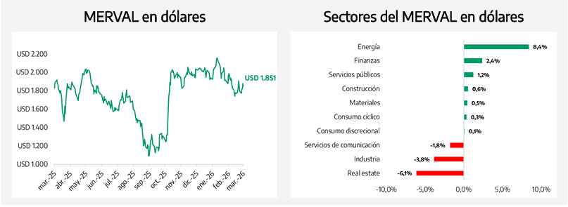 A nivel sectorial, el desempeño fue mayormente positivo en moneda dura, con liderazgo del segmento energético (+8,4%), seguido por finanzas (+2,4%) y servicios públicos (+1,2%). En contraste, los sectores más expuestos a la economía real mostraron mayor debilidad relativa, reflejando un posicionamiento más selectivo.